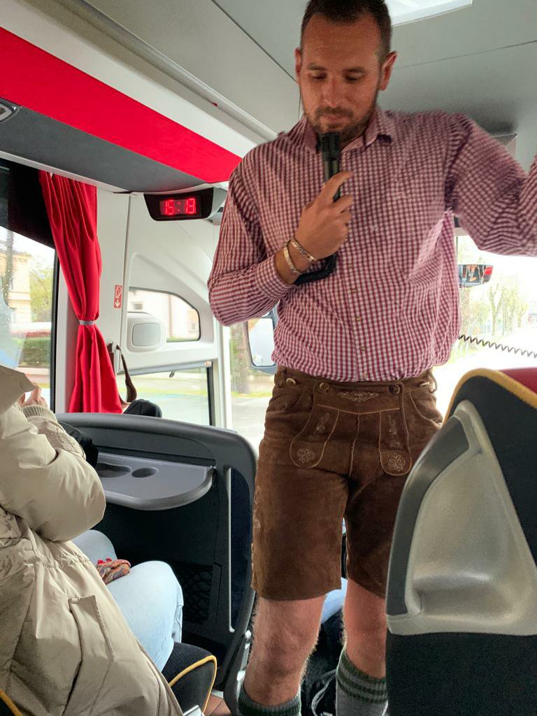 In the coach, much to our delight, Matt our tour leader was all set and dressed up in his German wear. That set the pace for the rest of the afternoon on the coach. At some point we were singing and dancing; I couldn’t find the videos or I would have posted some ๐. Due to delays earlier in the day – getting into Munich in late afternoon traffic proved tough, but we got there by 6pm.